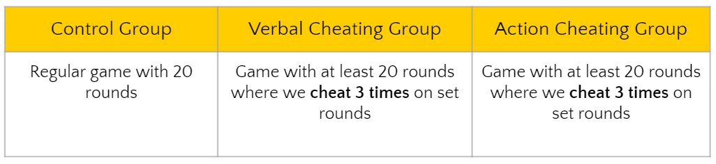 For our experiment we used the well-known game, RPS, to ensure the participant can easily detect when the opponent cheats. We conducted a between studies experiment for our group types to ensure there is no bias. Control Group: Regular game of RPS w/ 20 rounds. Verbal & Action Cheating: We played at least 20 rounds with 3 set rounds of cheating.