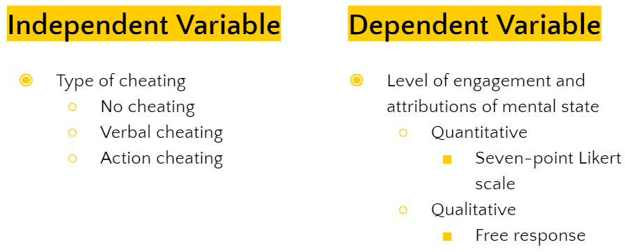 Because our conceptual replication tests whether we can get similar results using a virtual robot rather than a physical one, our independent variable is also the type of cheating that the robot uses when playing rock paper scissors. The levels of our independent variable are no cheating, verbal cheating, where the robot announces their win when the actual outcome is a loss or a tie, and action cheating, which is when the robot changes their move to a winning move before announcing their win. Our dependent variable is the level of engagement and attributions of mental state with our virtual robot and we use both quantitative and qualitative metrics to measure our dependent variable.